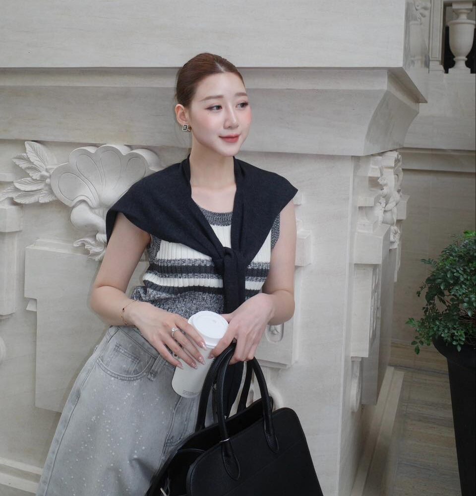 - Stylish sleeveless knit top featuring horizontal stripes in gray and white tones for a soft yet modern look.